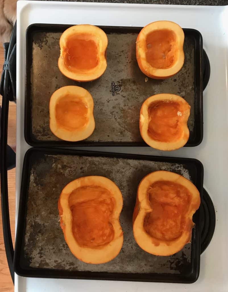 cut pumpkins in half and scoop out the seeds. Place on cookie sheet and roast for 30 minutes or so, until golden brown on edges. Scoop out the flesh and discard the skin.