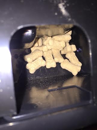The treat launcher is a lot of fun. Once you press the treat button, the camera mechanism whirls and clicks, and before long a couple mini treats are launched out onto the floor to the surprise of unsuspecting canines (and felines!). A bell chimes when the machine turns on, and the dogs quickly learned that the noises meant a treat would soon be launched. They waited, ears cocked, until the Petzi spat out the goods. (Ike did better at this, as Kelly is 14 and her hearing is not what it used to be.) Sometimes one treat came out, sometimes three or four. You can use different miniature treats, and crunchy treats work best.